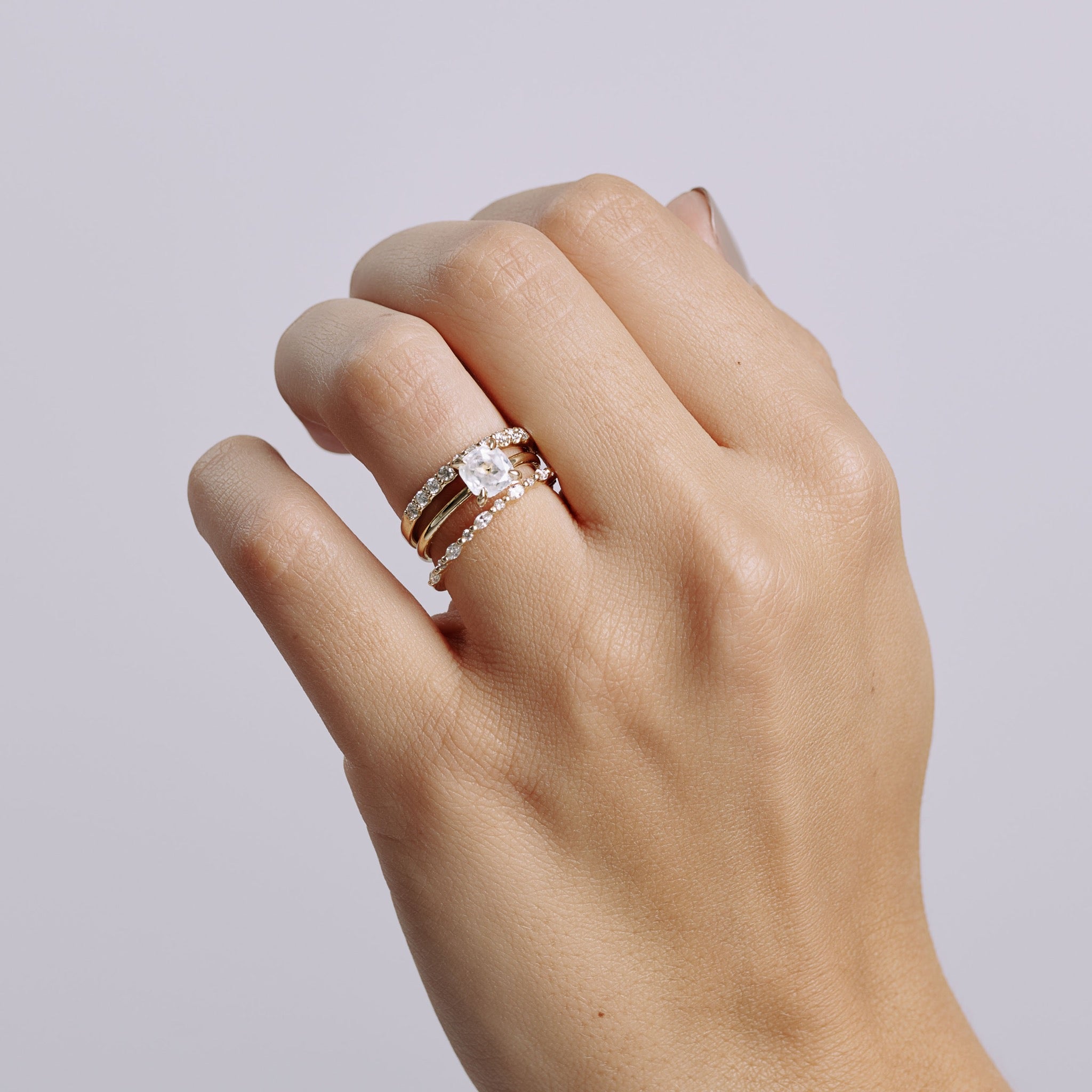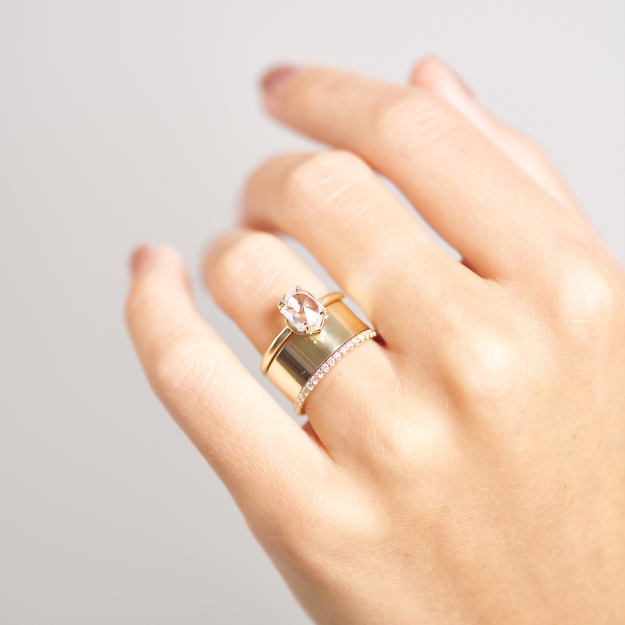 A curated stack of three to five rings to avoid overwhelming your hands