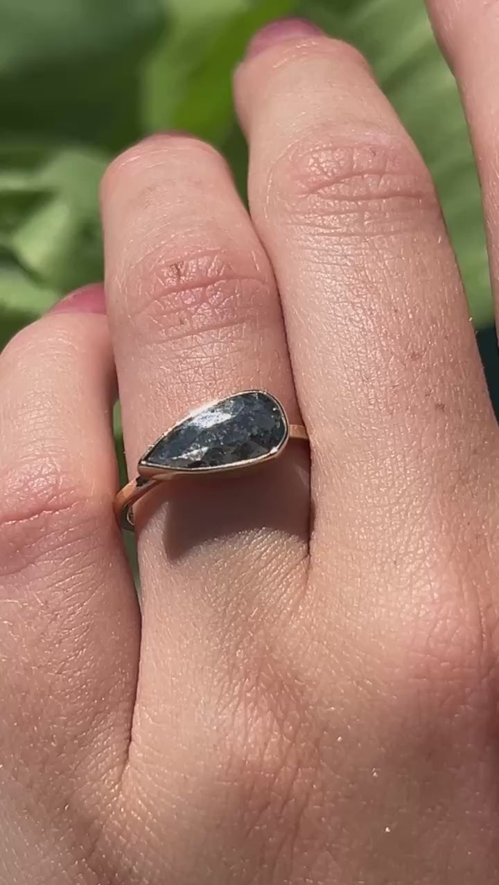 Mysterious, modern, and full of soul — the Ashlyn East-West Black Pear Diamond Engagement Ring is made for the one who loves to stand out effortlessly. The 2.5ct elongated black pear rose-cut diamond is bezel-set in solid 14K recycled yellow gold, its east-west orientation giving a bold, contemporary twist to a timeless silhouette. Each facet reveals depth and texture, like moonlight over dark water — a quiet nod to love’s complexity and strength. Handcrafted with intention and built to last a lifetime, this black diamond engagement ring is a striking symbol of enduring connection and individuality.