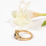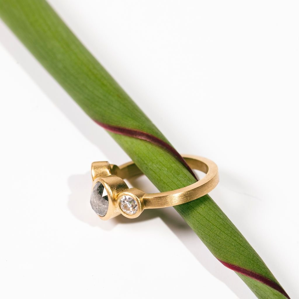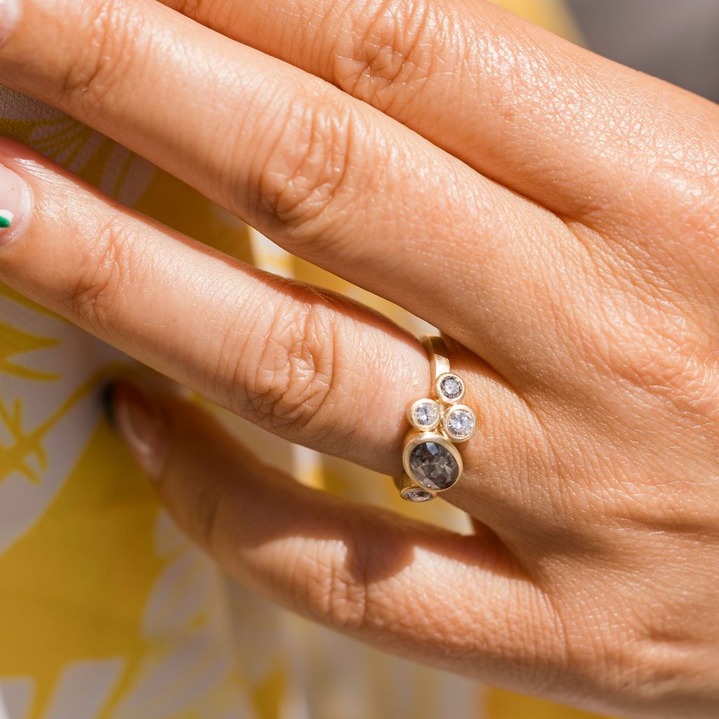 This 5 stone diamond cluster ring beautifully blends sparkle and texture with a unique arrangement of brilliant stones. At its center, a 1ct oval rose cut diamond (7x5mm) is surrounded by bezel-set 3mm, 2.75mm white diamonds and a 2.5mm gray diamond for depth and contrast. Crafted in 14k brushed yellow gold, this ring offers a warm, artisanal finish that complements its organic design. Perfect for the bride seeking an artisan-made bezel set diamond ring with layered elegance and timeless charm.