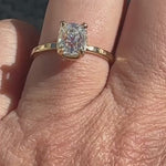 The Vintage Ring with an Old Mine Cut Diamond from our Misfit Diamond Collection. A 1.1ct Elongated Cushion Old Mine Cut, with it's charming uneven big facets and it's wobbly exterior, the uniqueness of this diamond is all you need. It's set in our solitare basket setting with a hammered dainty band to complete the vintage appeal.